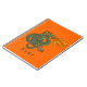 A vintage woodcut of a fire breathing dragon is coloured green. Background is orange. Your name or phrase in green below.