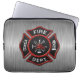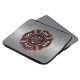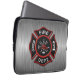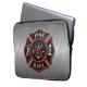 Fire Department red logo badge on brushed metal looking texture print background. Great for firemen and first respondents.