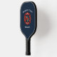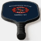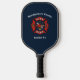 Stylish pickleball paddle design for firefighters and other fire department employees, family and friends. Design features generic fire department logo in red, with customizable top and bottom text on dark navy blue background.