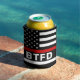 Thin Red Line Can Cooler - USA American flag design in Firefighter Flag colours. This personalized fire department can cooler is perfect for firefighter gifts, firefighter party favours, and to hand out at fireman promotional or support events.