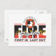 Fire Fighter with axe in fire fighter shield with flaming FIRE and RESCUE text! Proud, Strong and Brave upper text with FIRST IN LAST OUT below! Great fire fighting gift!