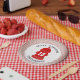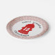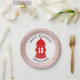 Birthday party plates featuring an illustration of a red fire hydrant and a brick border. Personalize the text. Matching napkins, invitations, and more are available at Jill's Paperie.