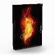 Bright peacock feather made of fire and flame on black background.