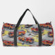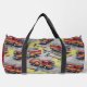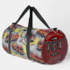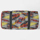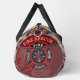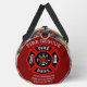 A grey duffle bag is covered in a vibrant pattern of red fire trucks, complete with ladders and fire axes, set against a light-coloured ground with yellow splashes. A prominent side pocket, adorned with a red fire department emblem, proudly displays "FIRE RESCUE," "JENNY SAMSMITH," "FIRE DEPARTMENT," and "Vancouver B.C.," creating a personalized and functional item for a firefighter. Personalize with your name and department home town and more. monogram