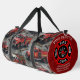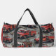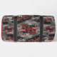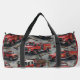 This duffle bag boasts a dynamic pattern featuring an array of red fire trucks with yellow stripes, alongside scattered fire axes. The realistic illustrations are set against a muted background that combines shades of grey and hints of yellow, creating an immersive scene. This design is perfect for those who admire the brave work of firefighters and emergency services. A prominent side pocket, adorned with a red fire department emblem, proudly displays "FIRE RESCUE," "JENNY SAMSMITH," "FIRE DEPARTMENT," and "Vancouver B.C.," creating a personalized and functional item for a firefighter. Personalize with your name and department home town and more. monogram