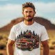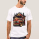 This custom T shirt features A classic red fire truck with flames and a skull design, set against a cityscape backdrop. symbolizing bravery and heroism,
