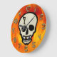 This spooky looking clock is great for Halloween - or year round in your bar, game room, or teen's bedroom. On a flaming background sits a scary, gold-toothed skull that looks 3-d. The numerals are made up of bone segments.