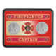 This Trailer Hitch Cover is decorated with the Firefighter Captain Silver Bugle Medallion Shield and the words "firefighter captain."