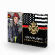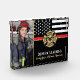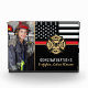 Cette conception comprend un drapeau de pompier avec des rayures noires et blanches, ainsi qu'une fine bande rouge. "Félicitations" et l'insigne d'un pompier est au-dessus du nom du pompier diplômé.