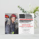 This design features a firemen's flag with black and white stripes, and a thin red line stripe as well. The flag sits above all of the party details for the graduating firefighter, which is next to a picture of the new fire academy graduate.