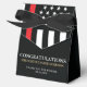 This design features a firemen's flag with black and white stripes, and a thin red line stripe as well. "Congratulations" and a fireman's badge sits above the name of the graduating firefighter. This design also works great for retiring firefighters, lieutenants, or chiefs. Celebrate in style!