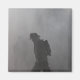 A magnet featuring a photo of a firefighter walking through a shower of water and smoke.