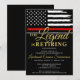 This design features a firemens flag with black and white stripes, and a thin red line stripe as well. "The Legend is Retiring" text sits above all of the party details for the retiring firefighter, lieutenant, or chief.