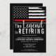 This design features a firemens flag with black and white stripes, and a thin red line stripe as well. "The Legend is Retiring" text sits above all of the party details for the retiring firefighter, lieutenant, or chief.