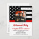 Celebrate your retirement and invite friends and family to your firefighter retirement party with this Thin Red Line Firefighter Retirement Invitation - USA American flag design in Firefighter Flag colours , distressed design . Personalize with name, address venue, and rsvp details. This firefighter retirement invitation can be used for firefighter graduation and promotion, simply change the text when personalizing.See our collection for matching fireman retirement gifts, party favours, and supplies. COPYRIGHT © 2020 Judy Burrows, Black Dog Art - All Rights Reserved. Firefighter Thin Red Line Custom Photo Retirement Invitation Postcard