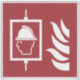 Firefighters' lift and flame icon on red background.
