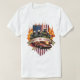 This custom t shirt features Four firefighters in full gear stand in front of an American flag with flames surrounding them, holding a hose towards a burning car. symbolizing bravery and heroism,