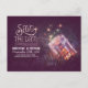 Special and purple save the date postcard with beautiful whimsical mason jar with glowing lights - fireflies - lightning bugs. Modern yet vintage save the date perfect for rustic country wedding themes.