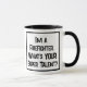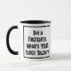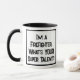 Funny slogan on a mug that says "I'm a Firefighter. what's YOUR super talent?". Two Tone Mug for a Fireman or Firefighter. Black and white bold text.