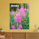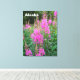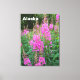 Features a digital painting of Fireweed (Epilobium augustifolium). Text reading "Alaska" is also present. The species name angustifolium is a portmanteau of the Latin words angusti meaning ‘narrow’, and folium meaning ‘leaf’. It shares this name with other species of plant including Vaccinium angustifolium. In mid to late summer Fireweed begins blooming in the middle of the stalk, with each successive flower blooming just above the one before it. When the last flowers bloom, at the top of the stalk, it is considered a sign that summer, or tourist season, has ended. At that time the earliest blooms seed and turn to cotton. When the fireweed turns to cotton, Alaskans say there are about six weeks until winter begins. Fireweed is often seen in open fields, pastures, and particularly burned-over lands; the common name Fireweed derives from the species’ abundance as a coloniser on burnt sites after forest fires. As a pioneer species it quickly colonizes open areas with little competition, makes it a clear example of a pioneer species. Plants grow and flower as long as there is open space and plenty of light, as trees and brush grow larger the plants die out, but the seeds remain viable in the soil seed bank for many years, when a new fire or other disturbance occurs that opens up the ground to light again the seeds germinate. Some areas with heavy seed counts in the soil, after burning, can be covered with pure dense stands of this species and when in flower the landscape is turned into fields of colour. In Britain the plant was considered a rare species in the 18th century; confined to a few locations with damp, gravelly soils. The plant’s rise from local rarity to widespread weed seems to have occurred at the same time as the expansion of the railway network, and the associated soil disturbance. The plant became locally known as bombweed due to its rapid colonization of bomb craters in the second world war. Reddish stems are usually simple, erect, smooth, 1½–8 feet high with scattered alternate leaves. Reddish-brown seed capsules bear many minute brown seeds, about 300 to 400 per capsule and 80,000 per plant. The seeds have silky hairs to aid wind dispersal and are very easily spread by the wind, often becoming a weed and a dominant species on disturbed ground. Once established, the plants also spread extensively by underground roots, an individual plant eventually forming a large patch. The leaves of Fireweed are unique in that the leaf veins are circular and do not terminate on the edges of the leaf, but form circular loops and join together inside the outer leaf margins. This feature makes the plants very easy to identify in all stages of growth. When Fireweed first emerges in early spring, it can closely resemble several highly toxic members of the lily family, however, it is easily identified by its unique leaf vein structure. The young shoots were often collected in the spring by Native American people and mixed with other greens. As the plant matures the leaves become tough and somewhat bitter. The southeast Native Americans use the stems in the stage. They are peeled and eaten raw. When properly prepared soon after picking they are a good source of vitamin C and pro-vitamin A. The Dena’ina add fireweed to their dogs’ food. Fireweed is also a medicine of the Upper Inlet Dena’ina, who treat pus-filled boils or cuts by placing a piece of the raw stem on the afflicted area. This is said to draw the pus out of the cut or boil and prevents a cut with pus in it from healing over too quickly. The root can be roasted after scraping off the outside, but often tastes bitter. To mitigate this, the root is collected before the plant flowers and the brown thread in the middle removed. In Alaska, candies, syrups, jellies, and even ice cream are made from fireweed. Monofloral honey made primarily from fireweed nectar has a distinctive, spiced flavour. In Russia, its leaves were often used as tea substitute and were even exported, known in Western Europe as Kapor tea. Fireweed leaves can undergo fermentation, much like real tea. Today, Kapor tea is still occasionally consumed though not commercially important.