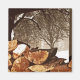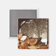 This magnet features a pile of firewood. The wood is stacked in the shed. Beyond the woodpile is a cold, snowy wintry scene.