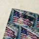 This American, flag image, is highlighted against, fireworks bursting, in a colourful display of, red, white, blue, and yellow, flares- in a cloudy, twilight sky, of slate-blue.