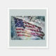 This American, flag image, is highlighted against, fireworks bursting, in a colourful display of, red, white, blue, and yellow, flares-in a cloudy, twilight sky, of slate-blue.