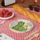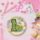 Grinning green dinosaur is celebrating your child's first birthday! Personalize and add your baby's name. Matching birthday party items are available!