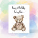 Cute watercolor teddy bear on a child's first birthday card. Name and sentiment can be changed. AI assisted graphic purchased with commercial use. Artwork: FreyasDigitalCrafts