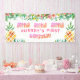 Bright, tropical watercolor flowers and pineapple birthday party banner sign that you can personalize with their name and age for a FIRST BIRTHDAY (or ANY birthday since the text can be changed to any age). Contact the designer via Zazzle Chat or makeitaboutyoustore@gmail.com if you'd like this design modified or on another size banner, on another product or would like coordinating items to complement your themed event for party decorations and supplies.