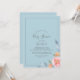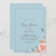 This first bloom baby shower invitation is perfect for a modern baby shower. The spring design features pink and orange watercolor flowers on a light blue background.