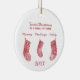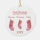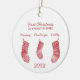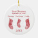 First Christmas as a family of three personalized names and year Scandinavian red and white stockings design. Change the names and date to customize. Original art by Nic Squirrell.