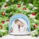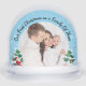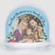 Mark your first holiday season as a family of three with this charming custom snow globe design. Set against a soft blue snowy background with playful snowflakes, a smiling snowman, and a festive Santa by snowy trees, your personal photo takes center stage. The elegant handwritten-style curved text reads "Our First Christmas as a Family of Three," making it a heartfelt keepsake or thoughtful holiday gift for new parents celebrating their first Christmas with a baby.
