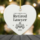 First Christmas as a retired lawyer heart ornament for a retirement. Elegant porcelain ceramic holiday ornaments in white with black lettering. Featuring Christmas trees and stars.