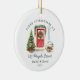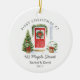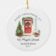 elebrate a new chapter with this white round ceramic ornament featuring a festive watercolor entry: classic red door with wreath and garland, potted trees with bows, and the arched headline “FIRST CHRISTMAS AT.” Lines below hold your street, names, and year, creating a warm first-home keepsake or housewarming gift. The rich holiday palette (red, green, gold) pops on any tree and photographs beautifully for listing photos. Update the address, add names, and set the year to make a timeless ornament you’ll hang every December.
