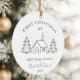 Celebrate a new chapter with a clean white round ceramic ornament featuring a minimalist house-and-pines line drawing and falling snow. The arched headline reads “FIRST CHRISTMAS AT,” with space below for street address, names, and year. The simple black-on-white design suits any décor and makes a perfect keepsake for first-home holidays or housewarming gifts. Update the address, add your names, set the year, and hang a timeless reminder of where your story began.