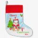 Celebrate your baby's first Christmas with this cute baby penguin Christmas holiday stocking which features a cartoon baby boy penguin wearing a hat and red neck scarf on a blue snowy background, holy leaves with berries and a decorated xmas tree. Text is in green and red and can be customized as needed- why not change 1st to 2nd or 3rd. Then personalize with the baby's name and year of birth. Great to give as a gift to 1st time parents or to family members . Makes a lovely keepsake.