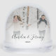 Commemorate your engagement with this beautiful modern keepsake snow globe. The text of Side 1 reads "Our first Christmas engaged," with the word "engaged" in elegant black handwriting script with flourishes before and after. On Side 2, add your names in the same black calligraphy script, with the year below in sans serif font. Replace the two sample images with your favorite photos. A white gradient filter helps make the text pop.