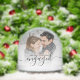 Commemorate your engagement with this beautiful modern keepsake snow globe. The text of Side 1 reads "Our first Christmas engaged," with the word "engaged" in elegant black handwriting script with flourishes before and after. On Side 2, add your names in the same black calligraphy script, with the year below in sans serif font. Replace the two sample images with your favourite photos. A white gradient filter helps make the text pop.