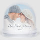 Commemorate your engagement with this beautiful modern keepsake snow globe. The text of Side 1 reads "Our first Christmas engaged," with the word "engaged" in elegant dusty blue handwriting script with flourishes before and after. On Side 2, add your names in the same dusty blue calligraphy script, with the year below in sans serif font. Replace the two sample images with your favourite photos. A white gradient filter helps make the text pop.