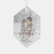 Commemorate your engagement with this beautiful modern keepsake ornament. The dark red text reads "Our first Christmas engaged," with the word "engaged" in elegant handwriting script with flourishes before and after. Replace the sample image with your favourite photo, and add your names and the year. A white gradient filter helps make the text pop.