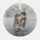 Commemorate your engagement with this beautiful modern keepsake ornament. The white text reads "Our first Christmas engaged," with the word "engaged" in elegant handwriting script with flourishes before and after. Replace the sample image with your favourite photo, and add your names and the year. A dark gradient filter helps make the text pop.
