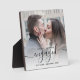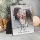 Commemorate your engagement with this beautiful modern keepsake plaque. The black text reads "Our first Christmas engaged," with the word "engaged" in elegant handwriting script with flourishes before and after. Replace the sample image with your favourite photo, and add your names and the year. A white gradient filter helps make the text pop.