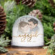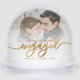 Commemorate your engagement with this beautiful modern keepsake snow globe. The text reads "Our first Christmas engaged," with the word "engaged" in elegant gold faux foil handwriting script with flourishes before and after. Replace the sample image with your favourite photo, and add your names and the year in gold-coloured sans serif font. A white gradient filter helps make the text pop.