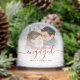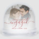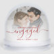 Commemorate your engagement with this beautiful modern keepsake snow globe. The festive red text reads "Our first Christmas engaged," with the word "engaged" in elegant handwriting script with flourishes before and after. Replace the sample image with your favourite photo, and add your names and the year in red sans serif font. A white gradient filter helps make the text pop.