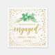 This elegant paper napkin is perfect for holiday engagement parties. The design features a sprig of watercolor holly with green leaves and red berries. Below is faux gold typography that reads "Our first Christmas engaged" with your names and year to personalize bordered by faux gold confetti. Designed by artist ©Susan Coffey.