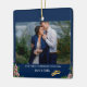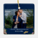 A stylish minimal photo holiday christmas ornament with classic typography "Our first Christmas engaged" in black on a clean simple minimalist blue background. The photo, greeting and name can be easily customized for a personal touch. A simple, minimalist and contemporary christmas design to announce your engagement to your loved ones! The image shown is for illustration purposes to be replaced with your own photo.
