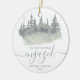 Commemorate your engagement with this beautiful rustic keepsake ornament. The sage green text reads "Our first Christmas engaged," with the word "engaged" in elegant script with flourishes before and after. The watercolor illustration features a winter woodland forest scene of evergreen trees in muted shades of sage green and gray.