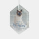 Commemorate your pet's first Christmas in their new home with this beautiful modern keepsake ornament. The words "First Christmas" appear in elegant blue script. Replace the sample image with a photo of your cat or dog and add their name and the year in blue sans serif font. A white gradient filter helps make the text pop.
