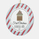 First Christmas in our new home has a red and blue striped background and a graphic of a house with Christmas light along the bottom of the roof.
